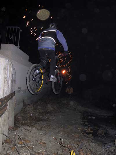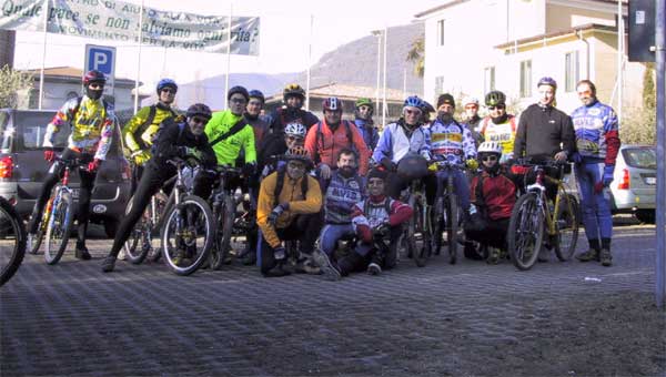 Al ristorante troviamo subito anche Mao e Max, e l'atmosfera si scalda con l'arrivo delle prime bocce di vino... ovviamente battaglia con le molliche e tra i commensali i discorsi più vari: bici, telai, forcelle, cambi, drop, VAM, VAC, VDM, BDM, VBI.... il fatto è che i più VBI di tutti sono quelli della cucina, che ci preparano una ceno sì ottima, ma tutto il contrario di ciò che sarebbe stato adeguato alla prova dell'indomani... quindi vino a iosa, 2 antipasti, 2 primi, 2 secondi, misto carne-pesce, spumanti.... un delirio! meno male che mi ero allenato ultimamente mangiando cotechini anche a colazione... Cap. IV --- LA NOTTATA --- bisogna smaltire... quindi non appena fuori si montano le bighe e si fa a fare urban! Apre le danze lo stesso Walter, che si acchiappa la Truzzi e si mette a fare scalinate, drops, impennate... mi sa che fra un paio d'anni lo vediamo sulle piste di DH! :-) cmq si gira prima nel borgo, e poi troviamo il pratone praticamente verticale che sta all'esterno delle mura e ci laciamo in un paio di picchiate furiose, con jolly del bros.... E' ormai la una, e qui le strade si dividono: - i saggi vanno a nanna... - gli stolti (ossia io, abete, Davide B., Max, Mao e Pippoz) andiamo a casa di quest'ultimo a guardarci un paio di videocassete di freeride/trial/xxx :-) e in questa maniera tiriamo le 3 e mezza. Tanto alle 8 ci si sveglia. Vi lascio immaginare le espressioni il mattino dopo, cmq ci si ritrova tutti i bikers e si parte in auto alla volta di Romano, dove si incontreranno anche gli altri.... A parte un mio errorino di navigazione che ci fa arrivare in ritardo di una mezzoretta tutto ok... si arriva, si montano le bici, foto di rito (e di Rita) e via! si parte!